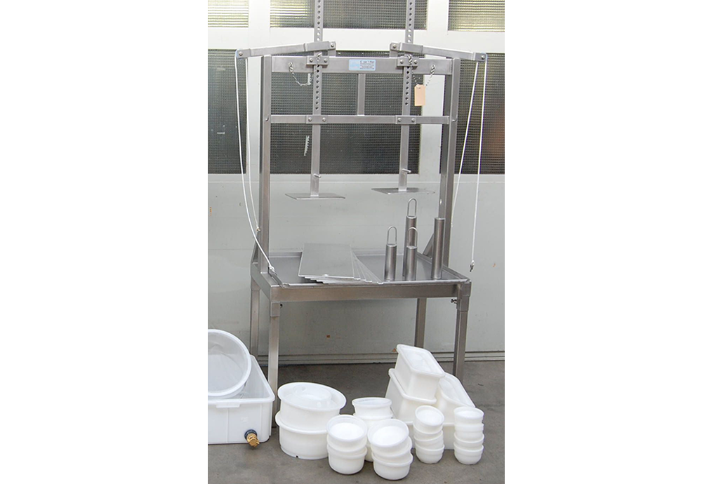 Authentiek persen in een modern RVS jasje. Door middel van verschillende RVS gewichten kan de persdruk van deze kaaspers aangepast worden. Eenvoudig in hoogte te verstellen perstempels maken het mogelijk om verschillende kaasvormen tegelijkertijd te persen.