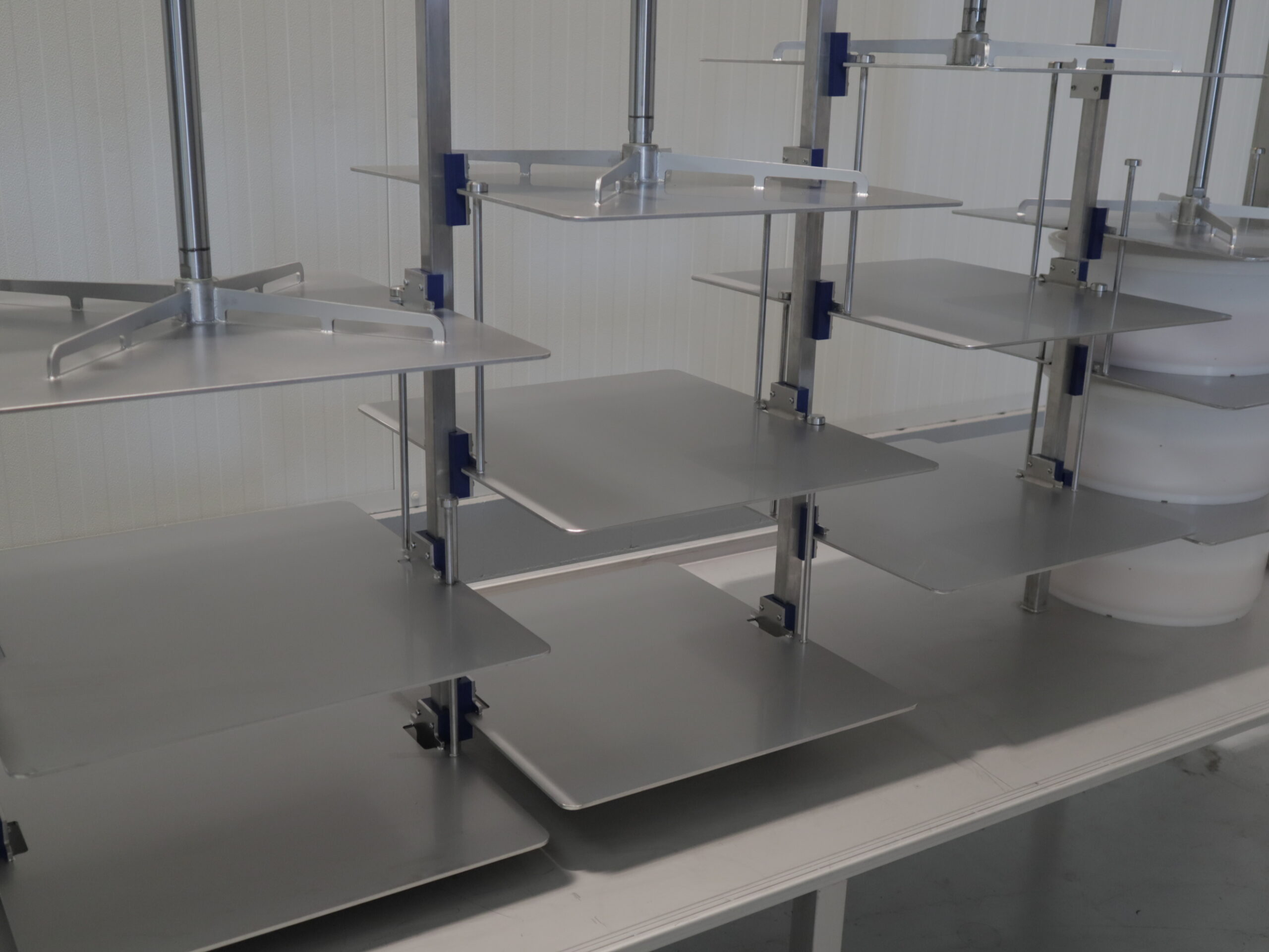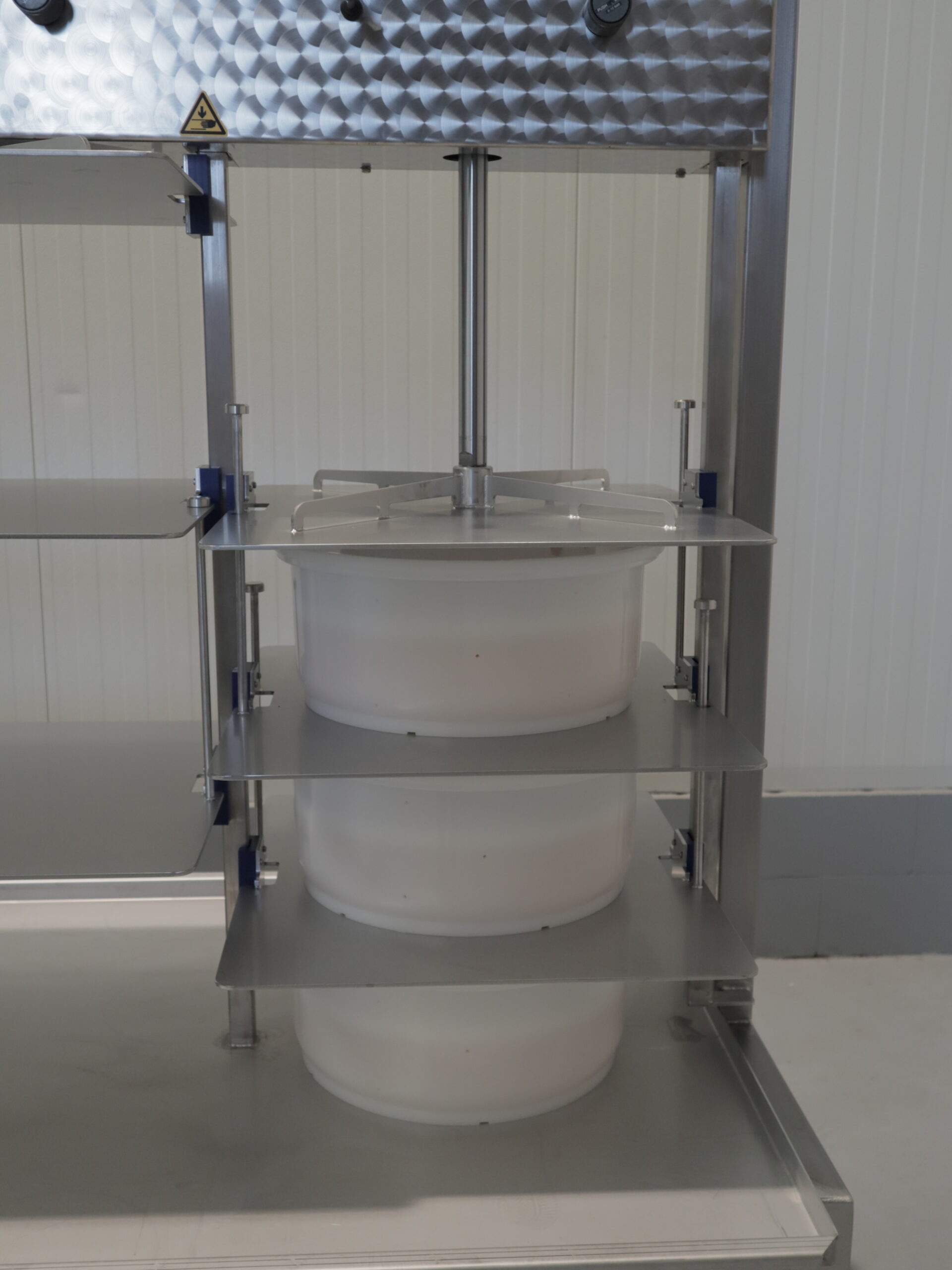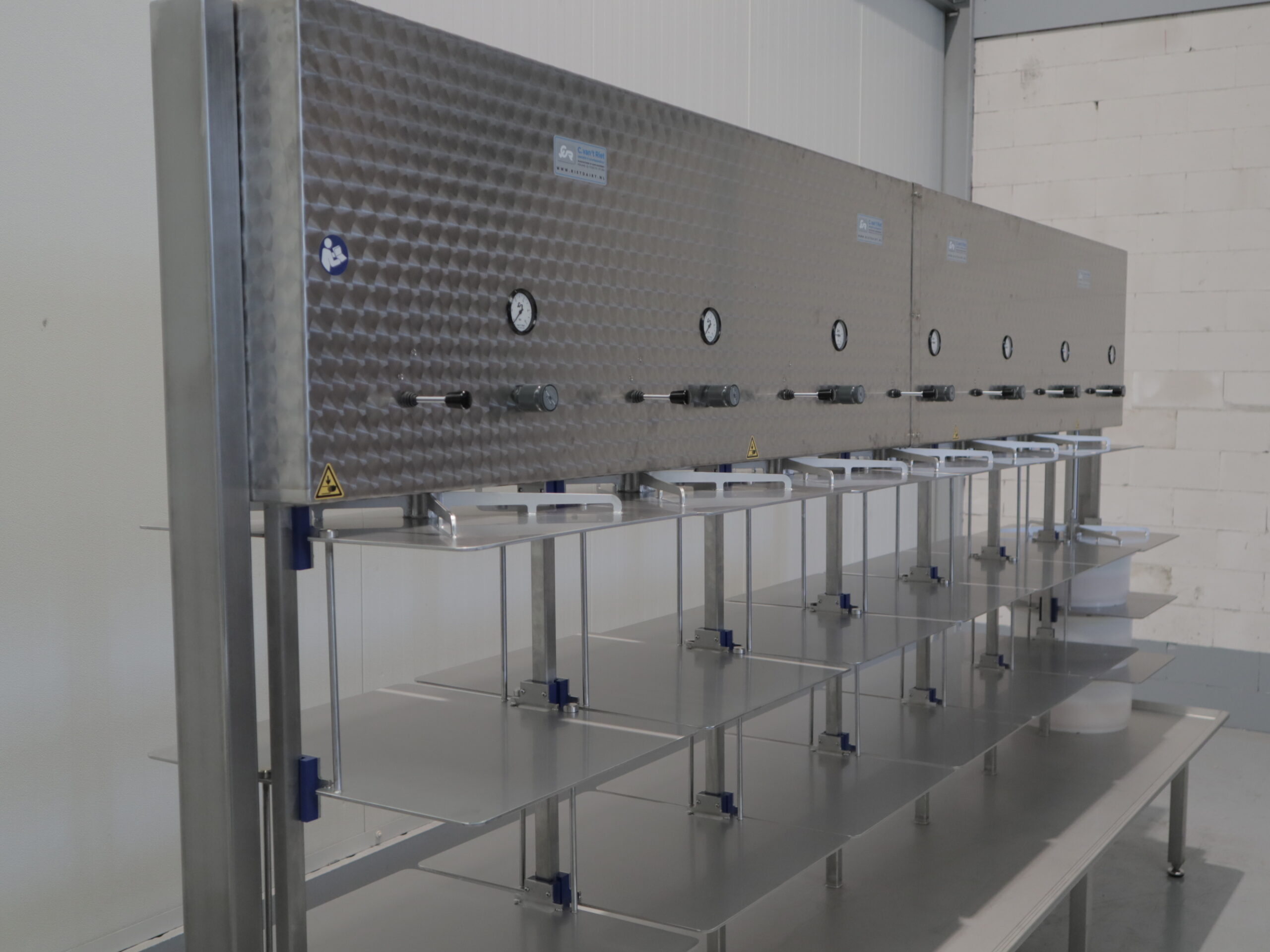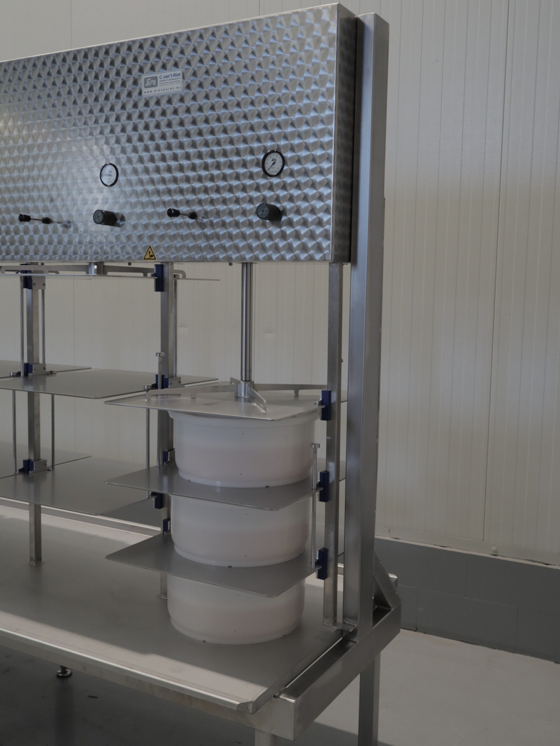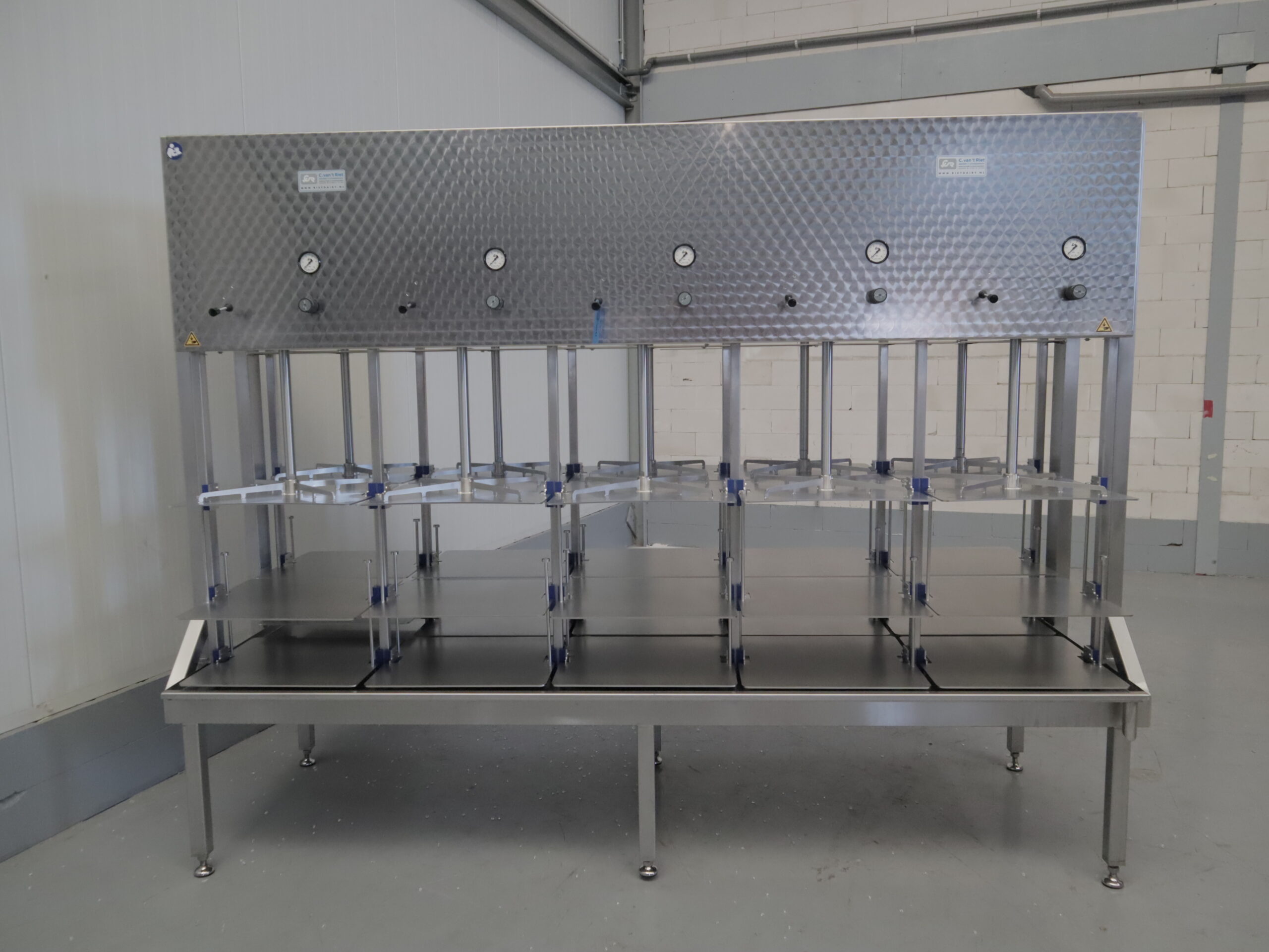 De pneumatische etage pers is de ideale pers om grote hoeveelheden kazen van dezelfde vorm tegelijkertijd te persen. Het eenvoudige ontwerp maakt het mogelijk om de kaasvormen in de daarvoor bestemde vakken te plaatsen. Er zijn geen losse persplaten nodig, waardoor er eenvoudig en ergonomische gewerkt kan worden. De kaaspers is voorzien van meerdere pneumatische cilinders, waarvan de drukregeling onafhankelijk per cilinder ingesteld kan worden. Deze kaaspers is voorzien van een RVS wei-opvangplaat met uitloop.