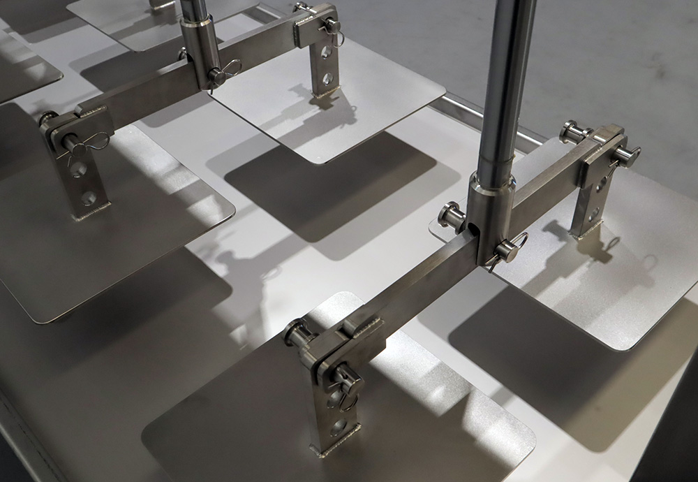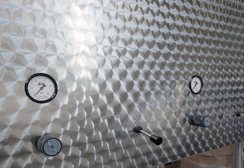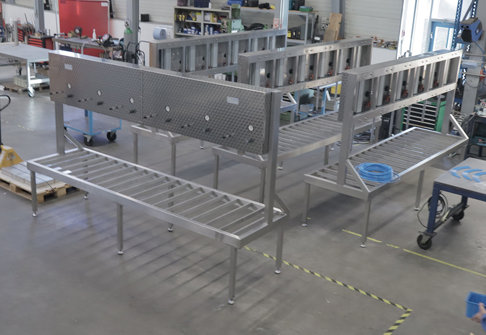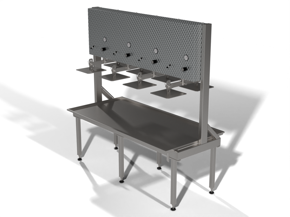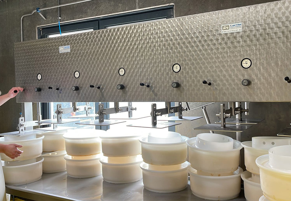 Deze kaaspers is voorzien van meerdere pneumatische cilinders waarvan de drukregeling onafhankelijk per cilinder ingesteld kan worden. Deze kaaspers is voorzien van een RVS wei-opvangplaat met uitloop.