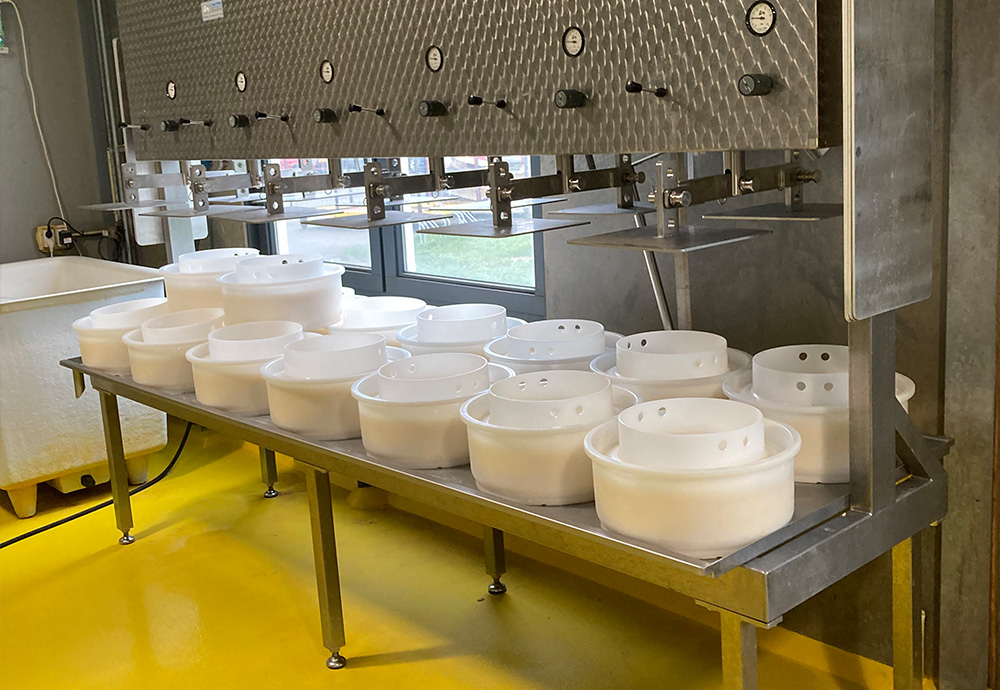 Flexibel persen van kazen met verschillende vormen – Dankzij de schommelarm met twee persstempels kunnen verschillende kaasvormen (met eventuele vullingsverschillen) tegelijkertijd geperst worden. Door de kaasvormen  met behulp van persplaten te stapelen op de RVS wei-opvangplaat kan er optimaal gebruik worden gemaakt van de beschikbare vloeroppervlakte.
